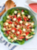 For salad: (If using chicken) Heat oil of choice in large skillet over medium high heat. Season chicken with sea salt and black pepper. Once pan is hot, carefully place chicken breast in skillet and cook for 5 to 7 minutes on each side. Chicken should reach 165 degrees F internally. Slice, dice or hand shred (once cooled) and set aside for salad.